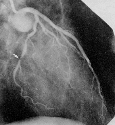 The arrow indicates a significant narrowing in the circumflex coronary artery.